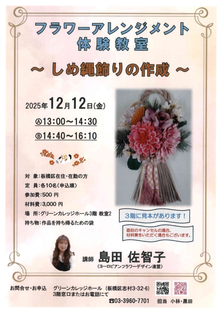 フラワーアレンジメント体験教室 🎍~しめ縄飾りの作成~🎍生徒募集